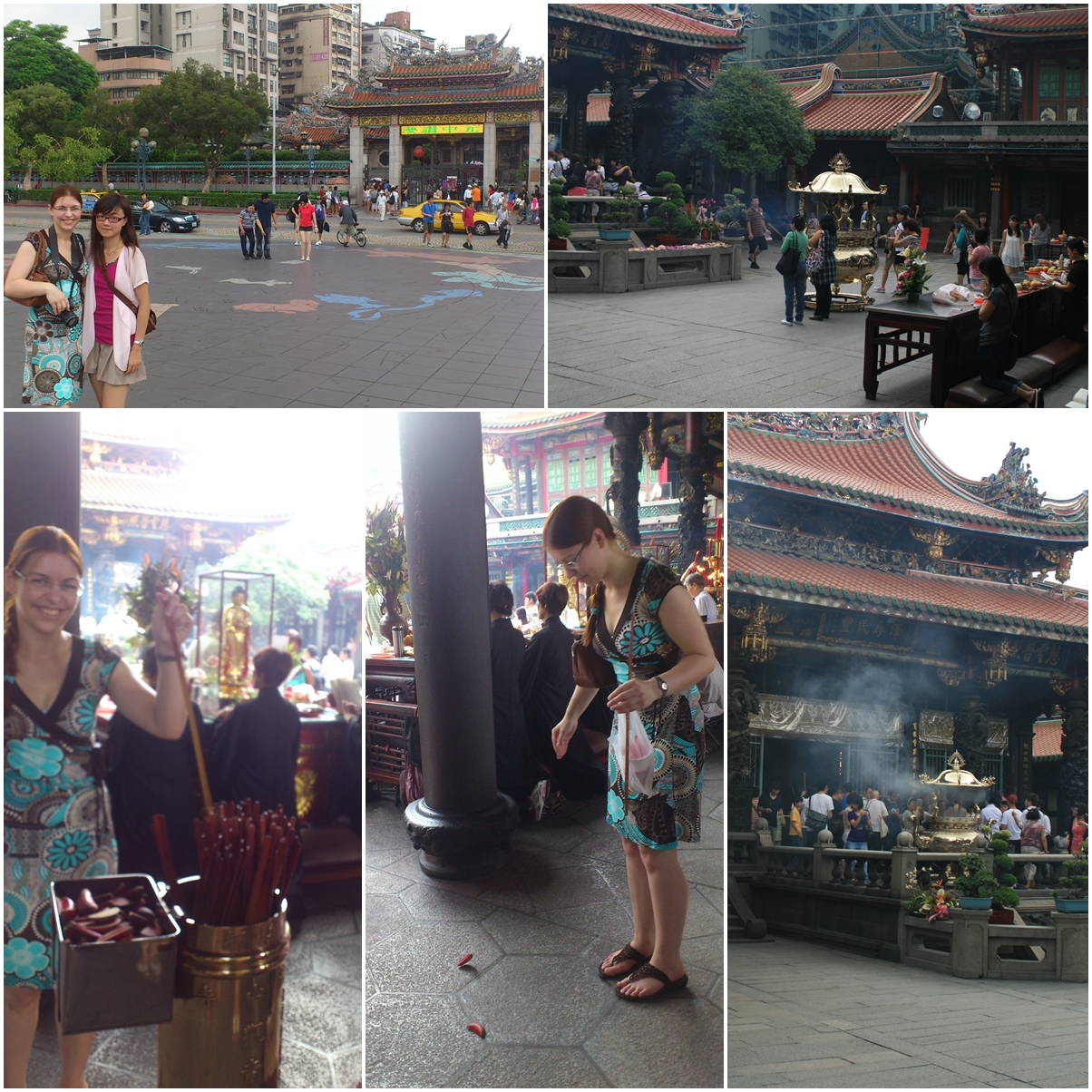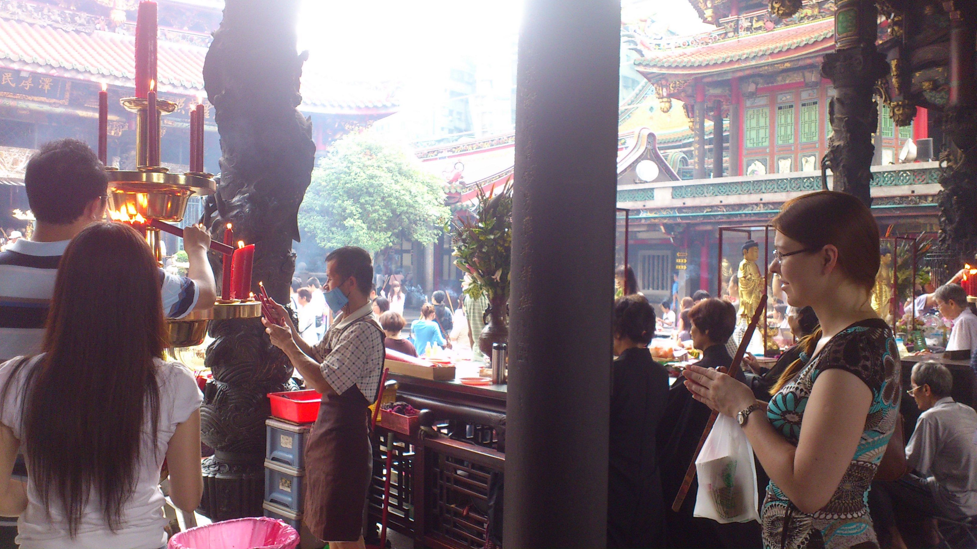 Today we went to Taipei earlier. Vivian’s parents also went to Taipei for the day and so we could join them in the car. Our first stop in Taipei was Lungshan Temple. This is a famous Buddhist temple that was founded in 1738 and rebuilt in 1919. For me it was very interesting to experience prayers in this temple. The temple has a main spot for prayer, but also many other spots. At these places one can pray to different gods depending on the topic. There is a god to pray for health and one that women who would like to get pregnant pray to. There is even one which you pray to if you wish to find a boyfriend/girlfriend.