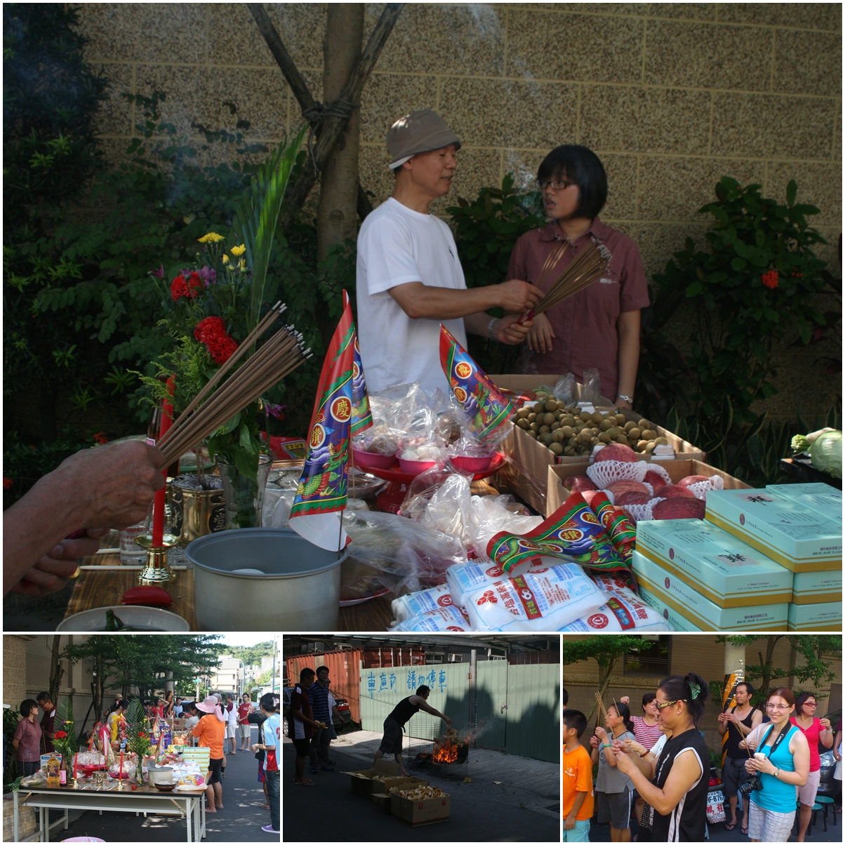 Before we went to Taipei on the first day we had a relaxed morning at the home of my host family. After a yummy lunch at a local restaurant Vivian’s parents joined their neighbours in preparing a ceremony to show respect to the ghosts (In the lunar calendar we have the month of the ghosts). For this ceremony they collect food for the ghosts on a big table. Also animal-ghosts get some appropriate food. There is even a bucket of water with toothbrush and toothpaste. Before the food is offered to the ghosts, paper money is folded in half and burned. Then people pray and put incense sticks into the food, this means that the ghosts can take the food.