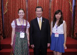 As you can see on the pictures I wore a Dirndl in Taiwan 😉 That was for the press conference and the farewell banquet in Taipei on the last day of the trip. At the press conference we met the vice president of Taiwan, Mr Vincent Siew. After standing in a queue for a while, Vivian and I took a picture with him: