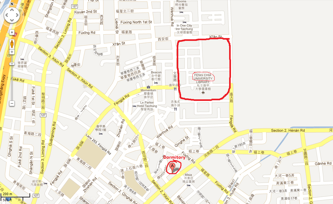 This screenshots shows the surroundings of the dormitory and where Feng Chia University is located.