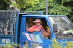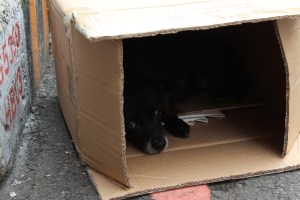At the bus stop an old man was working at piling up cardboard boxes on a wagon. Maybe for recycling? His dog was waiting patiently in one of the boxes.
