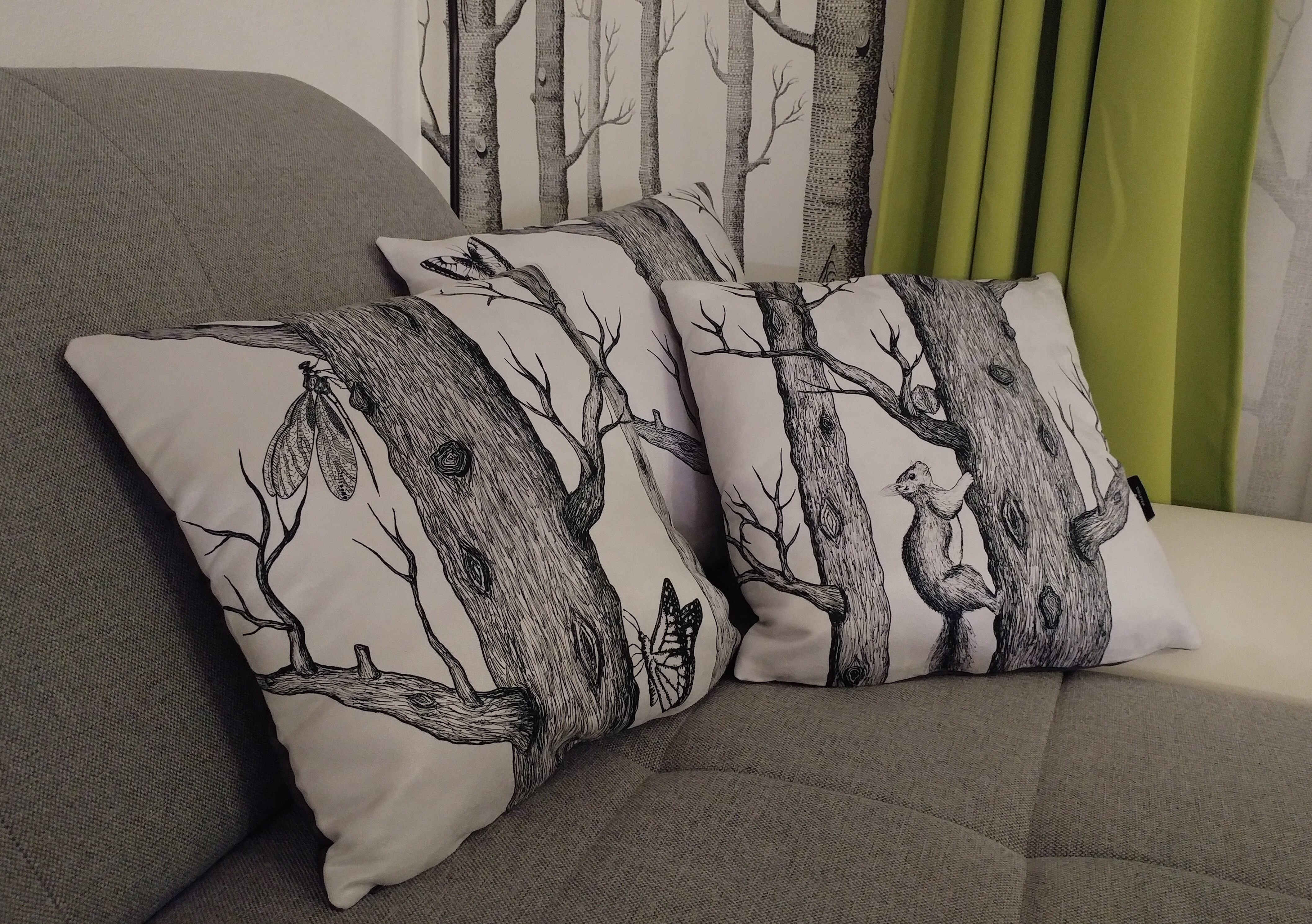 I drew my own birch trees (because of course I couldn’t upload the painting on the original wallpaper as my own art). This way the design fits to the wallpaper but is still my own. I am excited about the result and of course I ordered them for my own couch 😉
